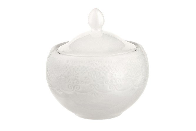 The Tracery porcelain sugar bowl is an excellent solution for everyday and festive table setting. The highlight of the line is the unusual, pleasant to the touch relief surface, which gives the dishes an interesting look. The material used is environmentally friendly, easy to clean, and does not absorb odors or dirt. The sugar container is equipped with a lid that organically completes the silhouette and protects the contents from dust, moisture and airing.