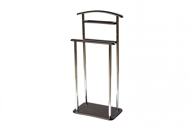 The Eldridge suit hanger is modern and functional. Thanks to the presence of two slats for trousers and a shelf for accessories, this version of a suit hanger is perfect for neatly storing things. The hanger is made of MDF material in combination with a chrome-plated pipe. The products are supplied unassembled, packed in corrugated cardboard. The kit includes all the necessary accessories and convenient instructions for assembly.
