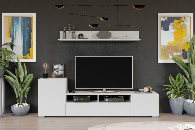 The compact Sylvia furniture set will allow you to create a comfortable and stylish TV area in the living room or any other room. The snow-white TV stand and open shelf, made in a laconic modern style, will enliven the interior and can be combined with furniture of any shade.