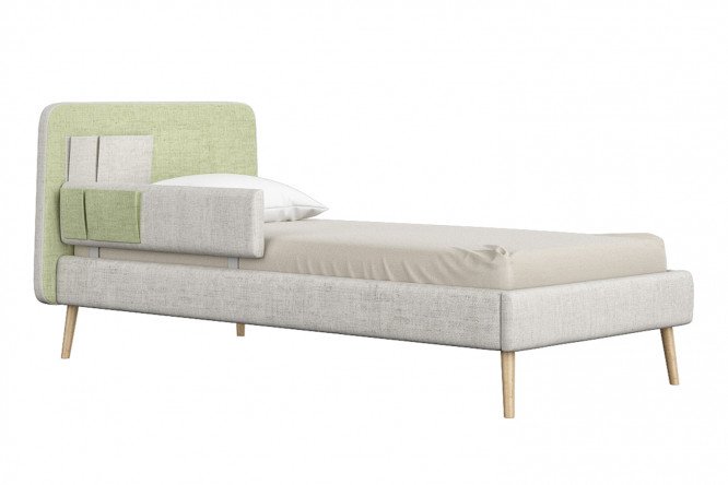 The bright and stylish soft bed has a solid birch base and solid beech legs. The bed has a comfortable soft backrest with pockets for storing small items.