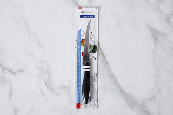 The Cor Cor knife is a model developed by the designers of the Brazilian brand Tramontina specifically for peeling and cutting tomatoes and citrus fruits. A narrow, slightly curved blade with fine teeth easily removes the skin from tomatoes and oranges and cuts them into thin, transparent slices. The handle is made of polypropylene and equipped with rubber rings that prevent your fingers from slipping. To increase the durability of the product, it is recommended to wipe it dry after washing.