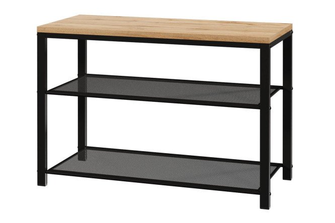 The Toronto bench has a laconic design that easily fits into the interior. Made from durable materials, the bench combines a metal frame and a seat made of laminated chipboard with imitation “Wotan oak”, which gives it a modern look. Compact dimensions allow it to be placed even in small spaces, and the open design with two shelves creates convenient access to shoes. The bench can hold up to six pairs of shoes while providing a comfortable place to sit when taking off or putting on shoes. Robust design details guarantee durability and reliability of use. Thanks to its versatile style and thoughtful design, the Toronto Bench is not only a useful, but also an aesthetically pleasing addition to the room.