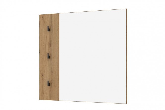The square wall panel from the Toronto collection is a harmonious combination of functionality and decorativeness, an ideal addition to the interior of a classic hallway. Thanks to a large mirror, the room will visually increase in size, become lighter and brighter. The base of the model is made of high-quality laminated chipboard in a spectacular Wotan Oak decor. The lively rustic pattern with dark cracks and knots looks very expressive. On the side of the panel there are three black metal hooks for hats, bags, umbrellas and other items.