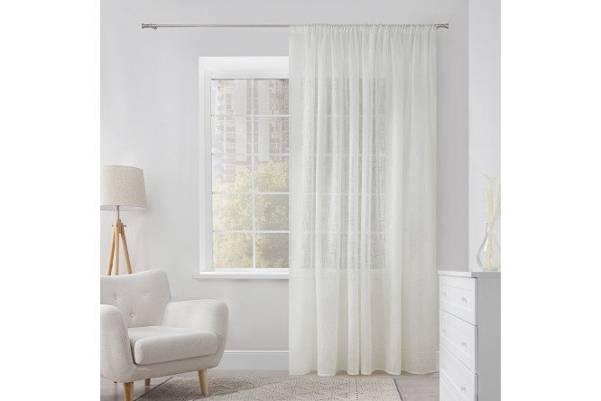 Light and moderately transparent tulle on a ribbon, thanks to its original texture, will organically fit into both a modern interior and a space decorated in Provence style. The linen-like texture with small strokes over the entire surface gives the product originality and nobility. Polyester tulle does not cause allergic reactions, does not electrify and does not attract dust. The practical fabric is easy to wash and iron, holds its shape well and retains its original appearance for a long time. Thanks to the curtain tape, it is easy to hang tulle either directly on the curtain rod or on special curtain hooks.