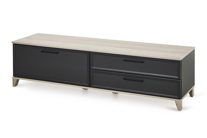 The Aurelio TV stand will decorate your living room and make it more cozy. The model has a laconic design: a clear silhouette, stylish color scheme. The tabletop, lower edging of the cabinet and support legs are in blackwood satin, which creates an impressive contrast with the main color. A long tabletop can easily accommodate a large diagonal TV and leave room for speakers or interior decor. Two drawers and one compartment with a folding door are what you need to store the things you need in the living room.