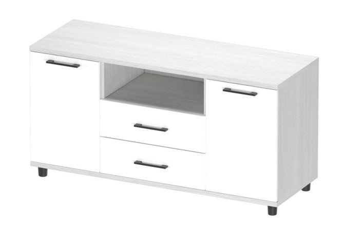 The cabinet is not only spectacular, but also roomy and comfortable. In addition to a niche for equipment, the design includes two compartments with shelves behind hinged doors and two drawers. Hinges and guides with closers ensure their smooth closing.