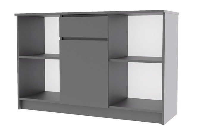 The product is made of laminated chipboard with a monochromatic matte finish. The design of the cabinet has open shelves, a compartment behind a hinged door and a drawer, which is very convenient for storing a variety of things.