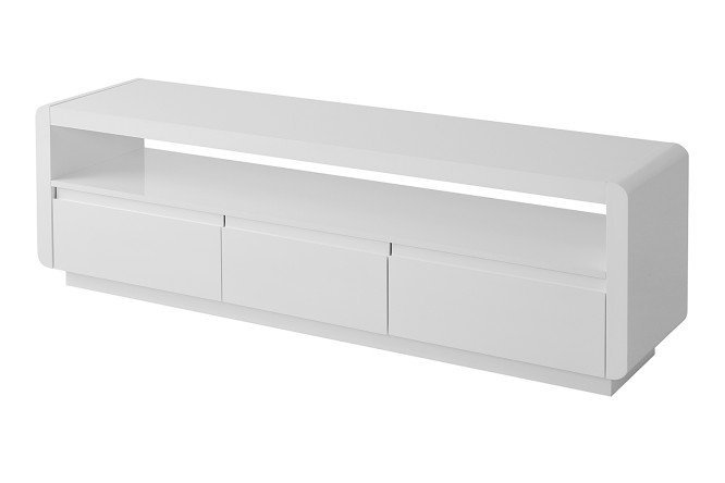 TV stand Madison – elegance of simple forms and practicality in one bottle. Now all your home multimedia devices can be stored in one place. The model is made in white and has a thoughtful design. A through niche under the thick tabletop is intended for audio and video equipment, and in three sections hidden behind the facades, accessories and other electronic devices can easily fit – 3D glasses, headphones, a tablet and more. The ergonomics of the exterior of the cabinet is achieved due to the rounded corners of the body and the absence of protruding handles for opening on the facades.