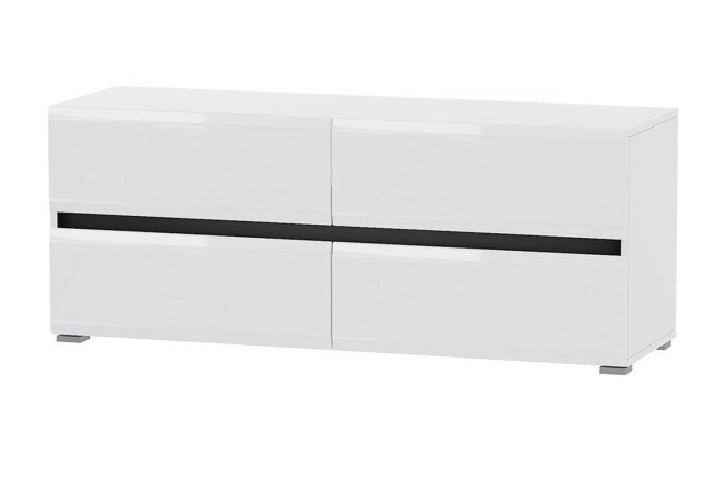 TV stand Sydney – a snow-white model in a laconic modern style. There is nothing superfluous in the design of the product; even the handles do not disturb the absolute smoothness of the facades. Nevertheless, the product looks very impressive thanks to the glossy facades and black insert, emphasizing the boiling white color of the coating.