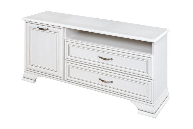The Tiffany cabinet will perfectly cope with the role of the logical and aesthetic center of the TV area in the living room. Laconic outlines, light decor, framed facades with a patina effect – the model combines style and convenience. On the left, behind the hinged door, there is a spacious section divided by a horizontal shelf: it is convenient to store remote controls for multimedia equipment, headphones, and a collection of CDs. The drawers are large enough to accommodate tablecloths and napkins. Characteristic details are massive curved legs and graceful handles with floral patterns.