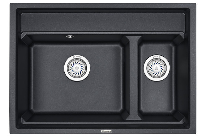 Granula sink with two bowls: the main one, wide and spacious, and an additional, narrower one, which serves as a compartment for rinsing fruits and vegetables, as well as for soaking dirty small dishes. The shape of the bowl is adapted to the functional roll mat. The sink is easy to clean and stain-resistant, resistant to high temperatures and fits perfectly to the countertop.