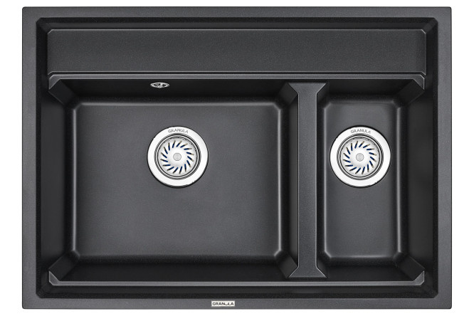 Granula sink with two bowls: the main one, wide and spacious, and an additional, narrower one, which serves as a compartment for rinsing fruits and vegetables, as well as for soaking dirty small dishes. The shape of the bowl is adapted to the functional roll mat. The sink is easy to clean and stain-resistant, resistant to high temperatures and fits perfectly to the countertop.
