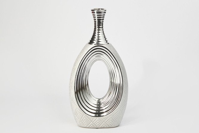 The silver tabletop vase can be used to display plants or decorate a room as a stand-alone piece of decor. The hole in the middle gives the accessory an unusual look, but limits the splendor of the bouquet that can be placed inside. A single flower, an exotic leaf with a flexible stem, or a branch with red berries will look best in a container with a narrow neck. The model is attracted by the charm of smooth lines, the elegance of textured patterns, and the contrast of matte and shiny surfaces.