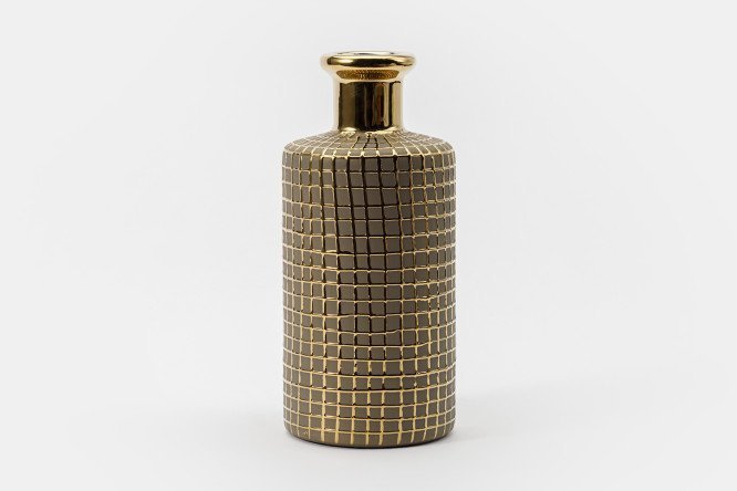 This tabletop vase in gold tones is reminiscent of a luxurious Art Deco perfume bottle, but it is spacious enough for a large bouquet. The accessory is made of ceramic, but it seems as if it was cast from real gold. The laconic geometry of the product is combined with exquisite decor. The main emphasis is on the textured surface of the product, imitating mosaic. The glittering gold grid effectively contrasts with the matte surface of the squares inscribed in it. This radiance echoes the shine of the narrow gilded neck. This unusual vase seems to have come from the refined Art Deco era with its sophisticated eclecticism and love for precious exotics.