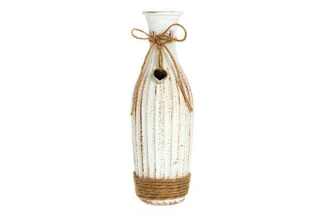 A glass vase in the shape of a bottle with a worn effect, a decorative cord and a heart-shaped pendant is so beautiful and unusual that it can decorate the interior on its own even without flowers. Place this model in your home and it will become a wonderful decorative element. Neck diameter: 2 cm.