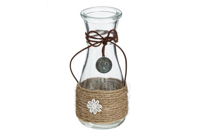 A glass vase with a decorative cord and a pendant in the form of a coin is so beautiful and unusual that it can decorate the interior on its own even without flowers. Place this model in your home and it will become a wonderful decorative element. Neck diameter: 3.5 cm.