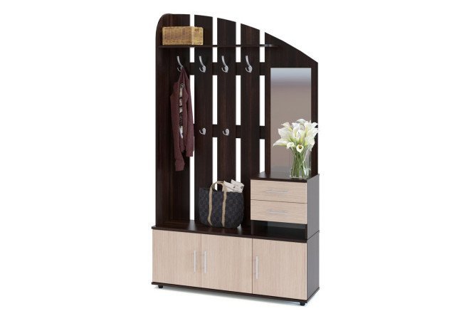The elegant entrance hall with a large mirror is made of 16 mm thick laminated chipboard, lined with PVC edge. The structure is installed on small supports. The open hanger with six coat hooks consists of four sections. Under the mirror there is a miniature niche with drawers, and below there are two storage cabinets. The fronts of the hinged doors and drawers are equipped with metal railing handles. The model is made in contrasting colors: light-colored bleached oak harmoniously combines with the noble wenge color, emphasizing its depth and richness. The model is supplied unassembled and equipped with fittings for mounting to the wall. The assembly is universal, right- or left-handed.