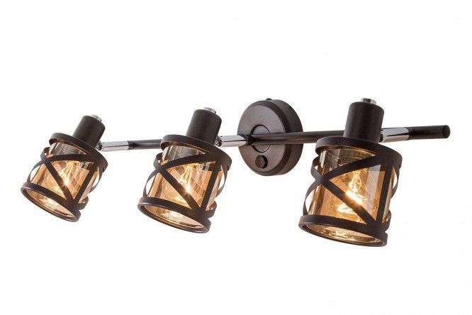 The Hessen wall-ceiling lamp is an original design made of metal and glass. A long rod with three rotating lights, fixed on a round base, can be installed on a vertical or horizontal surface. Each of the lampshades, stylized as a street lamp, consists of a brown cylindrical frame and a yellow glass bulb inside it. The spot will perfectly complement an interior designed in loft or country style.