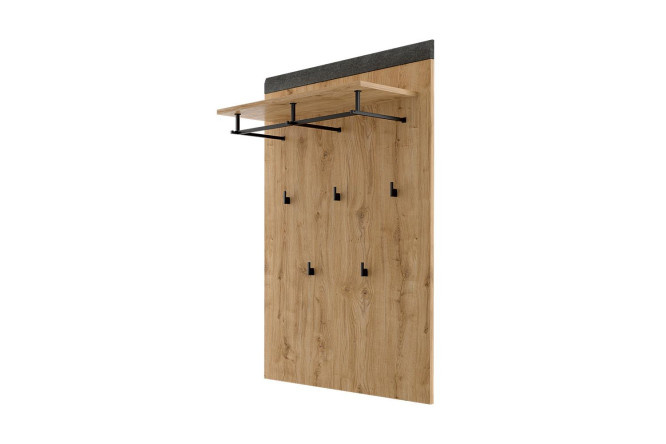 The hanger is a vertical board that is attached to the wall using brackets for hanging; the board contains a shelf, a composite hanger and hooks for clothes.