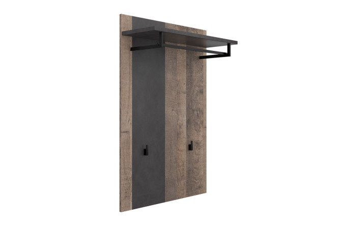 The hanger is a vertical board that is attached to the wall using brackets for hanging; On the shield there is a shelf, a composite hanger and hooks for clothes.