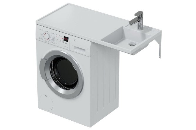 Sinks designed to be installed above washing machines are commonly called “lily pads.” The main advantage of this installation is the space saving in small studios and apartments, especially if the bathroom area does not exceed 2-3 m2. The drain hole for these sinks is not located in the central part, like most conventional washbasins, but closer to the back of the bowl, which does not interfere with the installation of the washing machine.