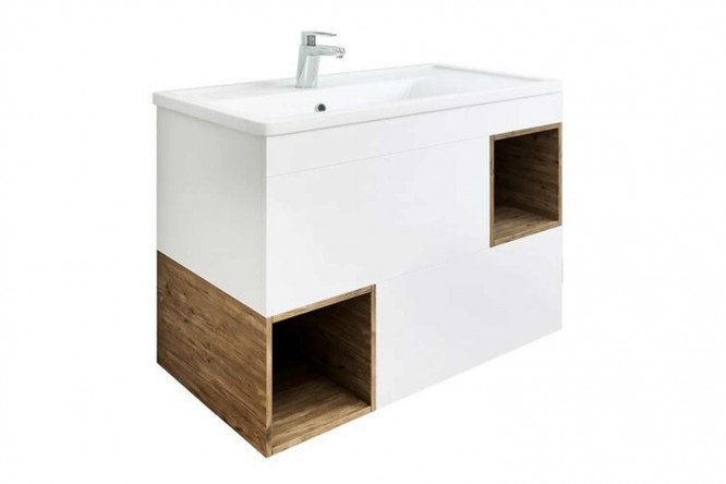 Wall mounted sink cabinet Sanflor Dallas 77 cm, matte white, rustic oak
