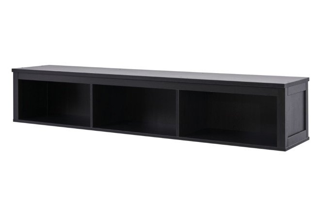 The Evans wall shelf is made of solid pine, painted black, while maintaining the visible structure of the wood.
