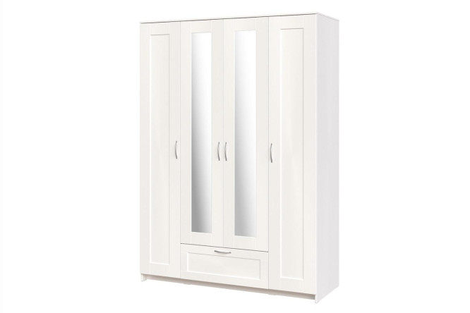 The four-door Sirius wardrobe with one drawer and two mirrors is the best option for organizing storage. The cabinet is equipped with a rod and one drawer; behind the hinged doors there are 13 shelves. The product is made of laminated chipboard 16 mm thick. The furniture is supplied unassembled, with all necessary components, instructions and assembly diagram. The cabinet must be attached to the wall.
