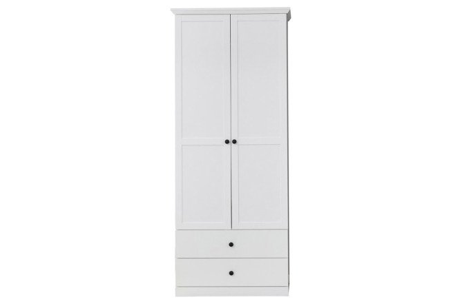 The snow-white Brandon wardrobe with solid hinged doors and drawers is suitable for installation in a living room, bedroom, hallway or office. To accommodate hangers with clothes, the closet is equipped with a retractable rod inside. The set also includes 5 spacious shelves for clothes, bed linen, and towels. The matte white finish and contrasting black handles make the furniture appear light and elegant, while being practical and functional. The Brandon wardrobe will become a real decoration for rooms in a modern, Scandinavian or loft style.