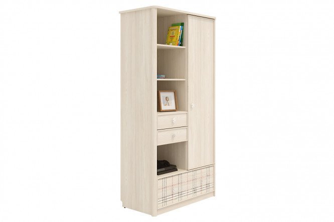 The design of the Cambridge wardrobe with open niches and closed shelves is universal and will allow you to place all your child’s things (both small and large) in the right order. Behind the swing door, equipped with modern hinges with closers, you can install shelves or a bar of your choice. Below, behind the checkered front, there is a large drawer on ball runners and another hidden drawer. The external ends are lined with rounded pilasters made of MDF, which gives the silhouette of the model a finished look. The body of the product is made of durable chipboard in an exquisite Scandinavian Pine wood decor.