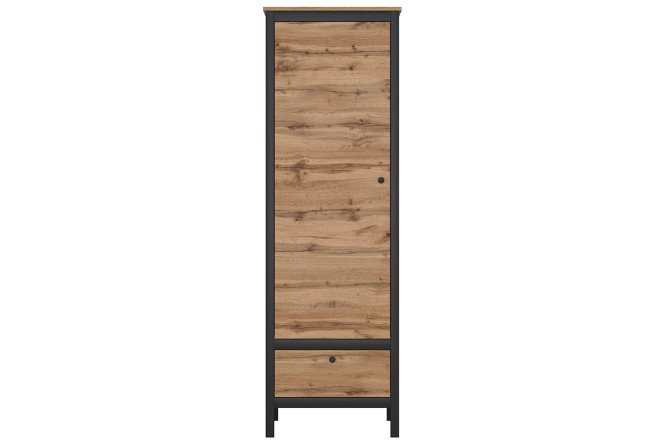 The Loft wardrobe with shelves behind a hinged door and a drawer is a spacious and stylish module from the furniture collection of the same name. The model with high legs is made in a laconic style; its main decoration is a spectacular combination of shades and textures. The Wotan oak finish with a pronounced pattern of annual rings and black trim around the perimeter are the ideal combination thanks to which Loft furniture will become an interior decoration.