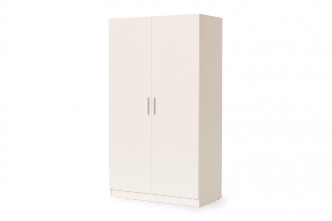 A hinged wardrobe made in a modern style will help you organize the storage of things in the bedroom correctly and will not take up much free space. The model is distinguished by its simplicity and severity of form, thoughtful content. The body and facades of the product are made of laminated chipboard in a neutral white color; the doors have comfortable handles. On the left there is a wardrobe compartment, where both short and long clothes will fit perfectly. On the right there is a spacious linen section with removable shelves: here you can fold bed linen, towels, and wrinkle-resistant clothes.
