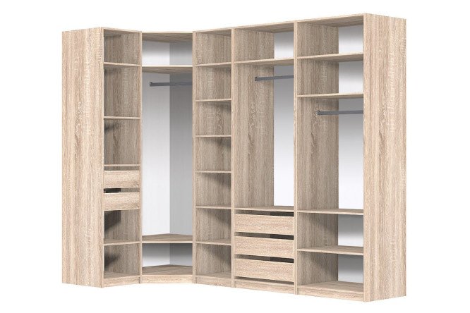 We select the contents with the name Oscar to suit your taste: shelves, drawers, rods. The width of each product corresponds to the width of the cabinet body: shelves and drawers are 3.2 cm less than the width of the cabinet body, rods are 3.9 cm less than the width of the cabinet. Shelves for corner cabinet 93.15 cm wide