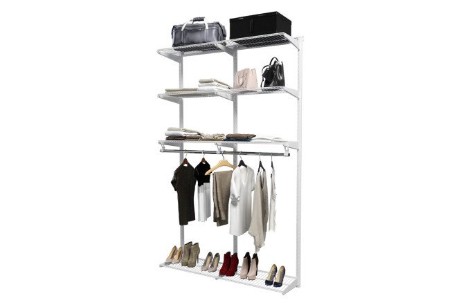 The TITAN-GS 74012134 wardrobe system will allow you to organize the storage of things in the hallway, bedroom, and pantry. The design has four shelves and a bar for hanging clothes on hangers. You can place boxes with linen, accessories, seasonal clothes and textiles in stacks neatly and compactly on the shelves. Everything you need is in plain sight, so you don’t have to waste time looking for the right things. The system is mounted on the wall on three supporting posts, on which brackets with shelves are mounted at a convenient height. The ability to choose the arrangement of elements is one of the important advantages of the product.