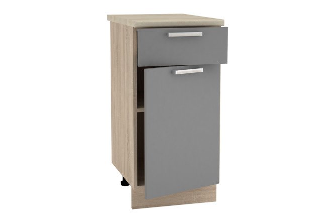 The Lyon floor cabinet with a drawer and two compartments behind a hinged door is a convenient, spacious and stylish storage system for the kitchen. It is convenient to store cutlery, accessories and gadgets in the drawer, and household appliances and food packaging will find their place on the shelves.