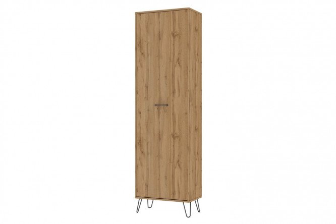 A wardrobe from the Toronto collection will be an excellent solution for the rational organization of space in the entrance area. The module is made of laminated chipboard – a high-quality material that does not require special operating conditions. The product is equipped with an end rod and two shelves. The top shelf is designed for storing seasonal items and hats, the bottom shelf is suitable for storing boxes of shoes. Metal legs ensure the stability of the structure and seem to lift it above the floor surface. The furniture module, made in Wotan oak color, will fit perfectly into the interior of a modern hallway. A light brown shade with a woody structure will create a feeling of warmth and harmony.