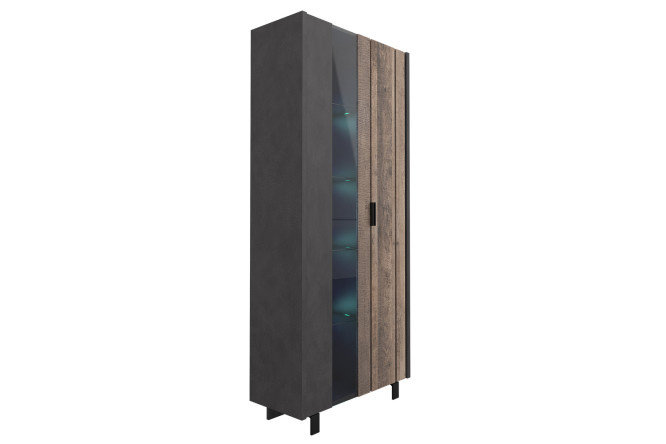The Ostin wardrobe attracts attention with its functionality, spaciousness and extraordinary design. Behind the door with an insert made of tempered tinted glass there is a compartment with four glass shelves. Decorative items will find their place here – their beauty will be emphasized by the LED lighting built into the display case. In the section with a blind door there are three shelves made of laminated chipboard – here you can arrange books, dishes, and fold table textiles. The decoration of the façade uses a combination of two decors, imitating the brutal texture of concrete and the grain of oak wood. The metal supports are equipped with polymer linings that protect the floor covering from damage.