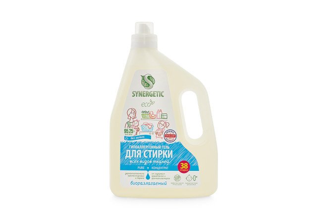 Biodegradable concentrated gel for washing all types of fabrics SYNERGETIC PURE provides gentle and effective cleaning of fabrics, hygienic cleanliness of clothes and eliminates unpleasant odors. The product can be used in any type of washing machine and for hand washing at a temperature of 15 – 90 °C. The combination of enzymes and plant surfactants effectively removes stubborn and fresh stains from fabric fibers, even in cold water and short wash cycles. Functional additives prevent the re-deposition of contaminants on the fabric, preserving its original appearance, color saturation, strength and structure. Active components prevent the formation of pilling, making the fibers smoother. The gel is suitable for washing colored and white linen made from natural and synthetic fabrics; it is not intended for delicate and membrane materials, as well as wool and silk. The biodegradable gel is completely rinsable from fabrics and is suitable for washing children’s underwear 0+ and clothes for people with sensitive skin.